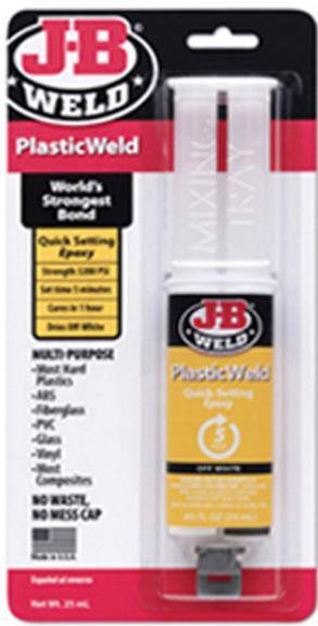 PlasticWeld is a specially formulated two-part adhesive and epoxy filler system that provides for strong, lasting repairs. PlasticWeld will bond a variety of surfaces, such as metal, composites, fiberglass and others. PlasticWeld sets in 5 minutes at room temperature and is fully cured in 1 hour. Using a 1:1 mixing ratio, PlasticWeld combines to a tensile strength of 3200 PSI and cures to an off-white color.