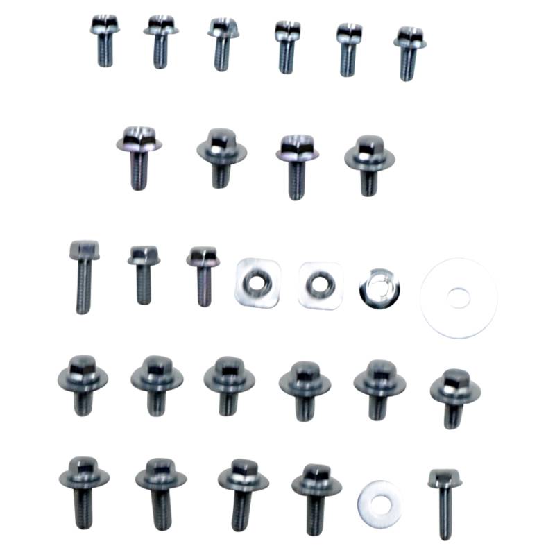 Includes all the factory replica fasteners and bushings for front fender, rear fender, front number plate, radiator covers, side panels, seat and fork guards in one set