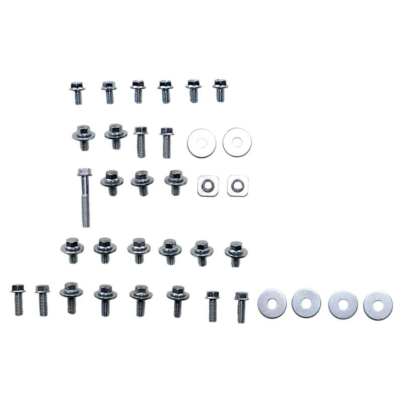 Includes all the factory replica fasteners and bushings for front fender, rear fender, front number plate, radiator covers, side panels, seat and fork guards in one set