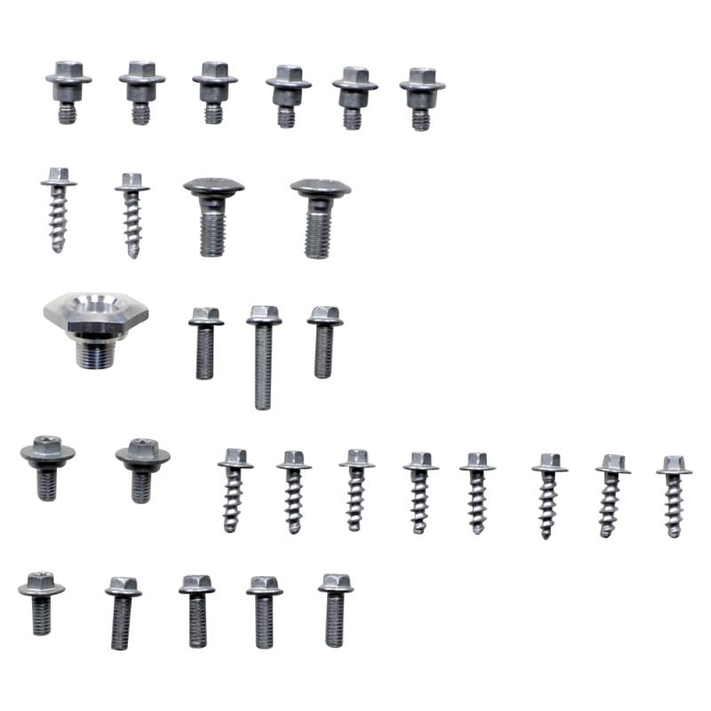 Includes all the factory replica fasteners and bushings for front fender, rear fender, front number plate, radiator covers, side panels, seat and fork guards in one set