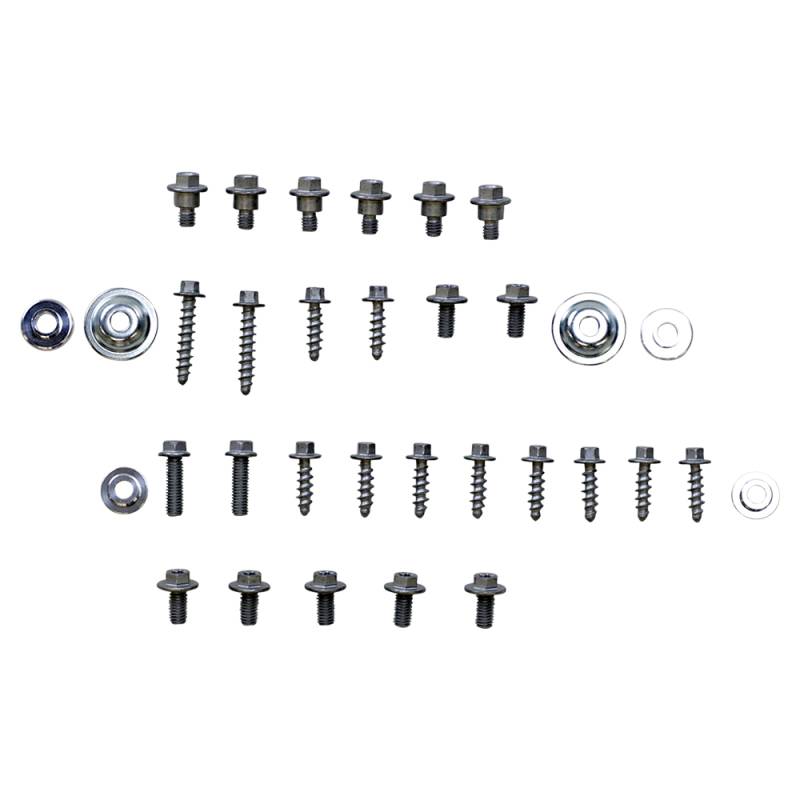 Includes all the factory replica fasteners and bushings for front fender, rear fender, front number plate, radiator covers, side panels, seat and fork guards in one set