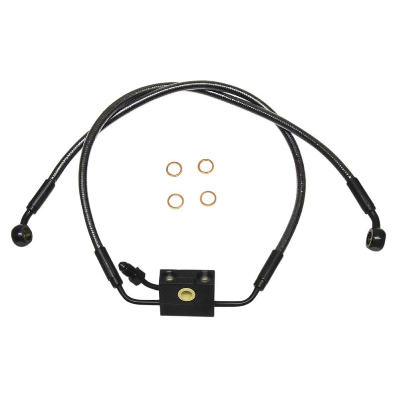 Brake kits utilize a two-piece design consisting of a direct bolt-on lower assembly used in conjunction with alternative length upper lines.