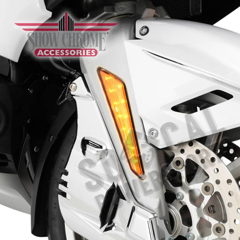 Big Bike Parts now offers its top selling Dual Function Marker Lights for the 2018 and newer Gold Wings with either Amber or Red lenses. The bezeling on these new marker lights enhance light dispersion and the colored lenses help intensify the color matched LEDs. These LED Marker Lights use 24 of the latest and brightest SMD LEDs available to replace the OEM reflectors. The LED assemblies are sealed for weather protection and come with embedded bolt, locating pin and double sided tape to insure a secure fit. Reflective backer behind the LEDs maximizes the candela output of the LEDs. Includes full instructions, t-taps and spade connectors for a convenient installation. Sold as pair of Red or Amber Marker Lights and can be installed as running lights and turnsignals for increased safety.Big Bike Parts now offers its top selling Dual Function Marker Lights for the 2018 and newer Gold Wings with either Amber or Red lenses. The bezeling on these new marker lights enhance light dispersion and the colored lenses help intensify the color matched LEDs. These LED Marker Lights use 24 of the latest and brightest SMD LEDs available to replace the OEM reflectors. The LED assemblies are sealed for weather protection and come with embedded bolt, locating pin and double sided tape to insure a secure fit. Reflective backer behind the LEDs maximizes the candela output of the LEDs. Includes full instructions, t-taps and spade connectors for a convenient installation. Sold as pair of Red or Amber Marker Lights and can be installed as running lights and turnsignals for increased safety.