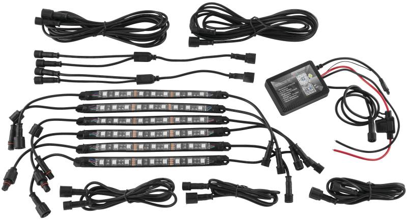 Universal, 6 pc. RGB Accent Light Kit features a 6in. strip with 9 ultrabright SMD LED chips and a waterproof connector on each side, allowing for maximum mounting flexibility. Can be used for illuminating foot wells, under the body, under seats or anywhere inside the cab.