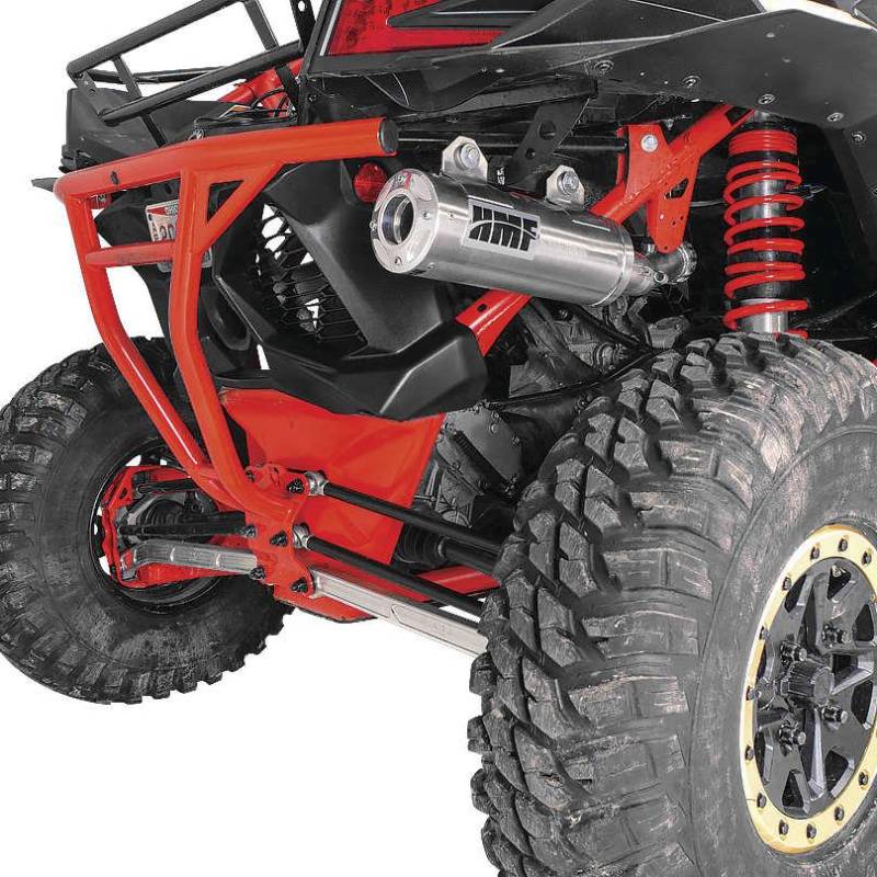 Side-mounted, single system exhaust intended for competitive, high-performance UTV racing.