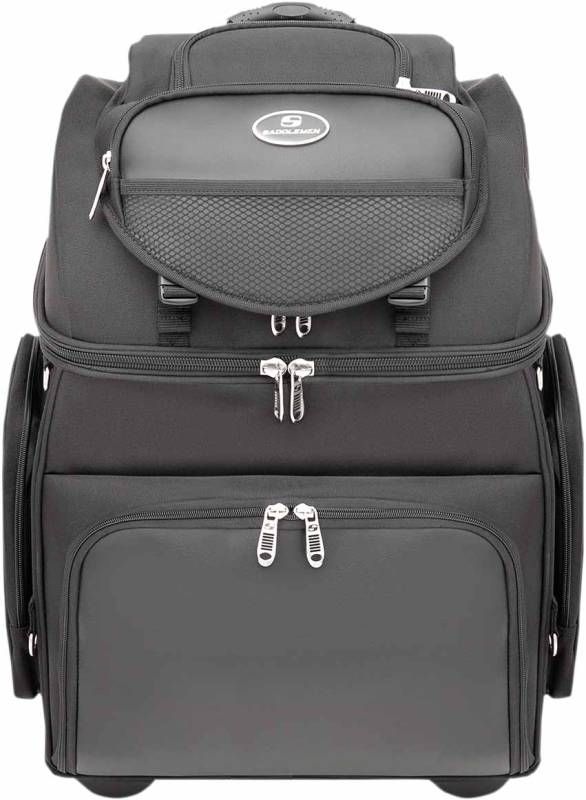 Rugged blend of fabric and leather-grained materials look great on any type of motorcycle; internal structure maintains bag shape even when empty