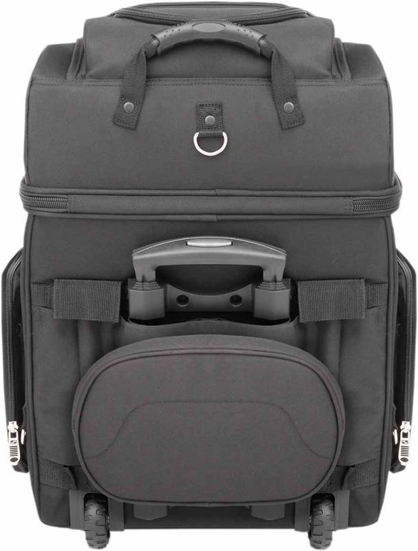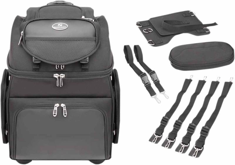 Two mounting systems includeda seat harness or adjustable sissy bar strap system easily attaches bag motorcycle seat, luggage rack or sissy bar