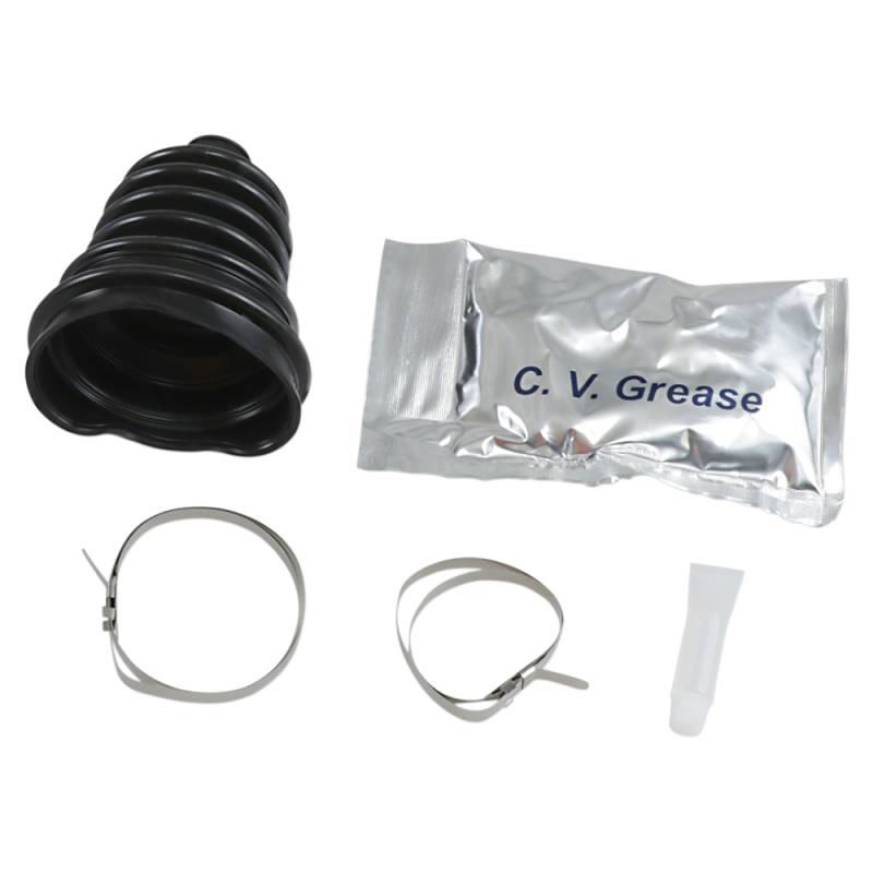 Kit includes one universal boot, one reusable cone tool, two stainless steel clamps, grease pack, and silicone cone lube and instructions