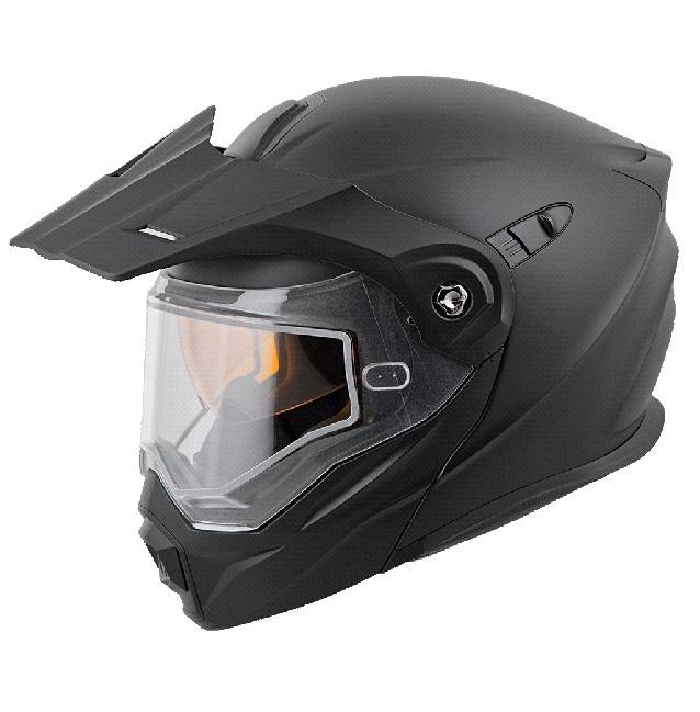 the exo-at950 can be used as a full face adv helmet with external peak visor attached, or the peak visor can be removed and you have an 'rodynamic touring helmet. the no-fog everclear face shield can be removed and you can use the exo- at950 as a dirt helmet with goggles for off-road use. our oversized eye port is extremely wide for greater peripheral vision and downward visibility, and the modular chin bar can be con veniently flipped up when you stop to get gas or ask f or directions. the internal drop down speedview sunvisor and kwikwick ii liner will keep you comfortable all day long even as lighting conditions change throughout the day. Three shell sizes made of advanced lg polycarbonate and dual density eps, result in a helmet that is light weight, strong, and protective.