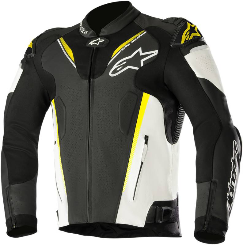 CE-certified Alpinestars GP-R protectors on elbows and shoulders with external dual-density TPU sliders at shoulders, GP Pro protector cups at elbows