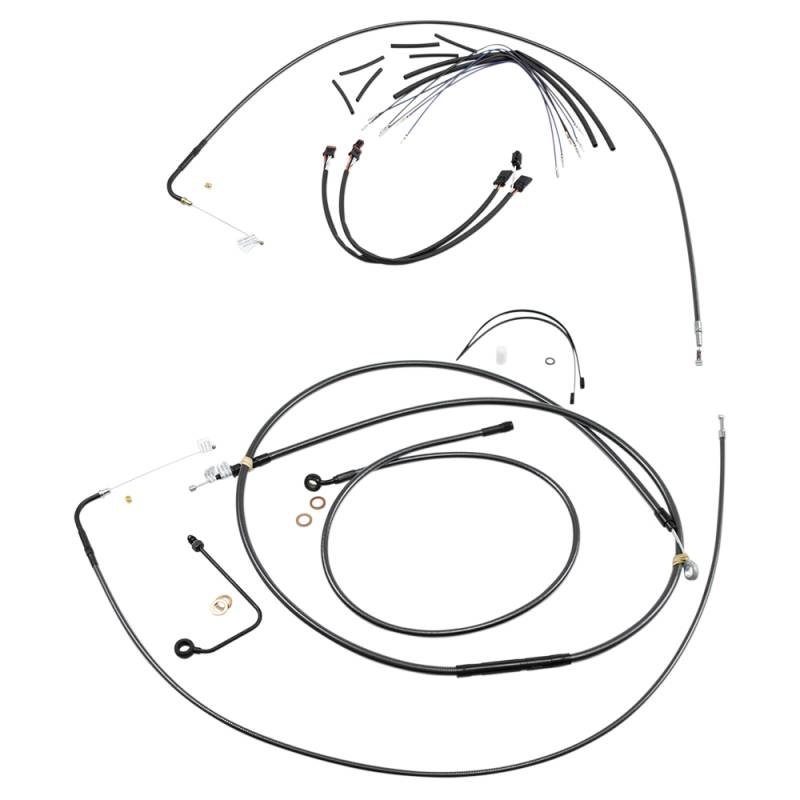 Kits include throttle and idle cables (except 08-15 Dressers), clutch cable or hydraulic clutch line, front brake lines, copper crush washers, hardware and correctly colored wiring extensions with OE-style connectors and shrink tube