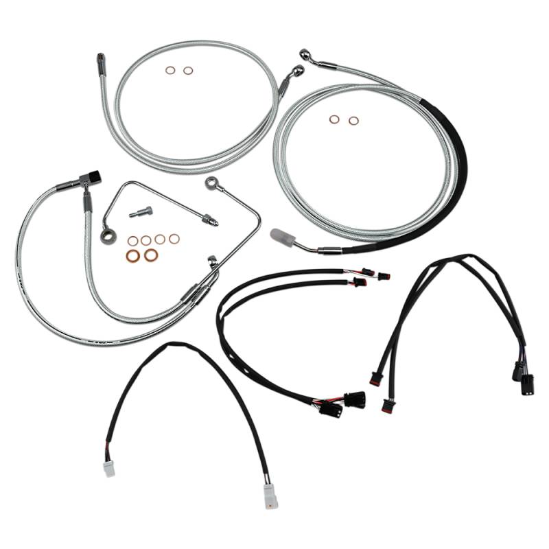 Kits include throttle and idle cables (except 08-15 Dressers), clutch cable or hydraulic clutch line, front brake lines, copper crush washers, hardware and correctly colored wiring extensions with OE-style connectors and shrink tube