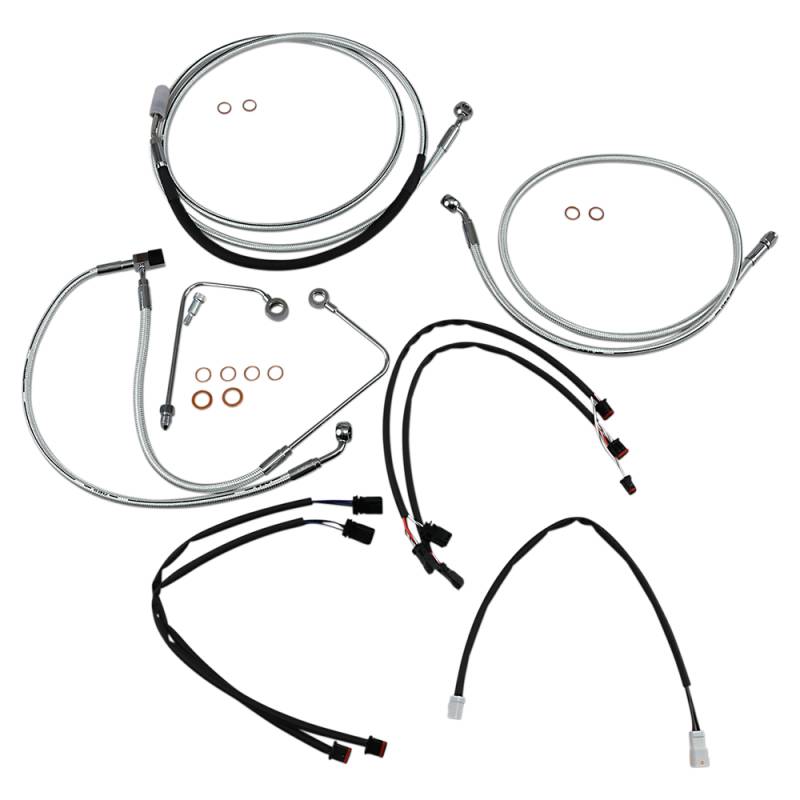 Kits include throttle and idle cables (except 08-15 Dressers), clutch cable or hydraulic clutch line, front brake lines, copper crush washers, hardware and correctly colored wiring extensions with OE-style connectors and shrink tube