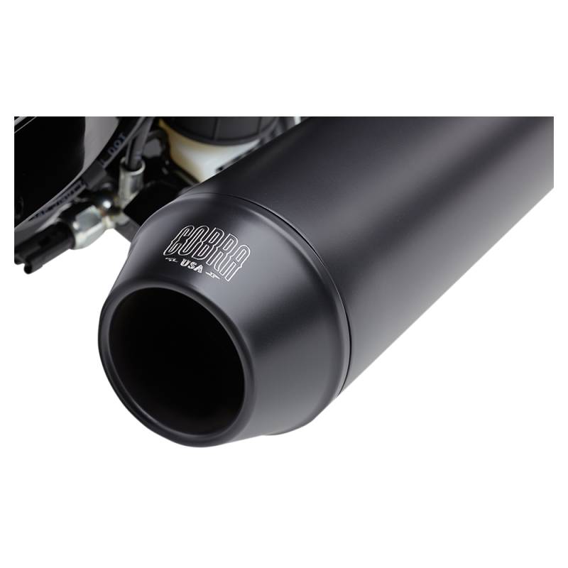 The machined aluminum tip is powder-coated black, and etched with the Cobra logo. The tips reverse cone shape tastefully complements the upswept cone muffler. Heat shields cover the exhaust headers and the collector nestles beneath a simple chromed/or black cover.
