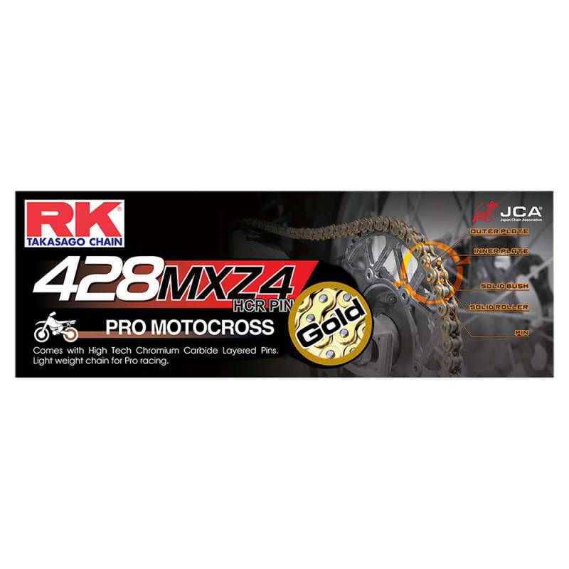 RKs MXZ4 chains are made for supercross and motocross racing. MXZ4 chains feature chromoly steel construction with seamless rollers and bushing. RKs Chromized pins drastically improve the wear resistance more than two times compared to normal non-sealed chains while absorbing shock loads from extreme jumps. All components are heat treated using RKs exclusive HIT (Heat Induction Transfer) process.
