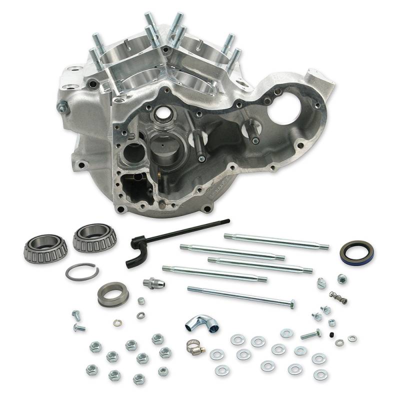 Include crankcase bolts, washers and nuts, cylinder mounting studs, timing hole plug, magnetic drain plug, assorted breather and oil line fittings, top end oil screen spring and plug, sprocket shaft Timken bearing assembly, oil seal, pinion shaft main bearing race, cam needle bearing assembly, oil pump shaft bushings and installation instructions