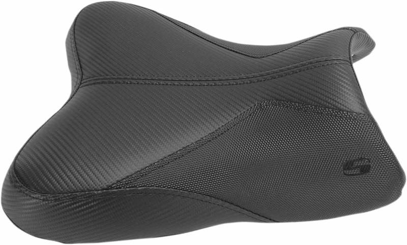 Faux carbon fiber seating area features grippers on the seat sides to maintain the best control of the motorcycle