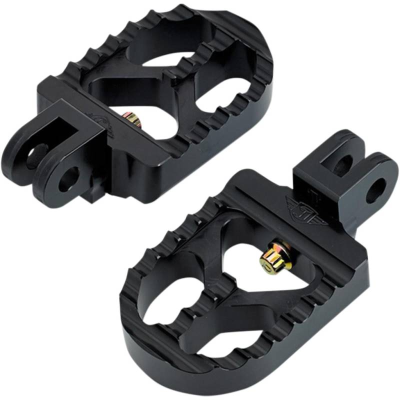 Footpegs have Jokers exclusive pitch adjustment screw that enables you to change the angle of the peg in order to adjust it to a level riding position (if necessary) so the pegs dont appear to lay down with time, vibration, etc.