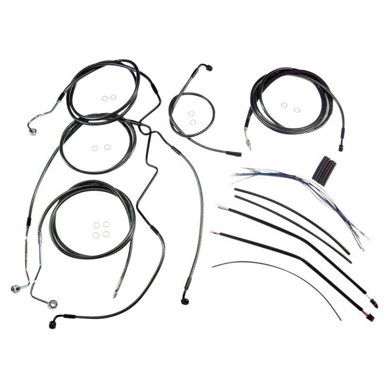 Kits include throttle and idle cables (except 08-15 Dressers), clutch cable or hydraulic clutch line, front brake lines, copper crush washers, hardware and correctly colored wiring extensions with OE-style connectors and shrink tube