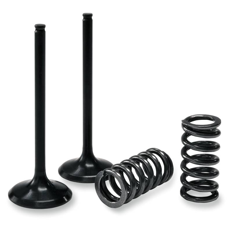 Kit contains a set of steel intake or exhaust valves plus a set of specially designed valve springs; can be installed using the OEM retainers, bases and valve seals