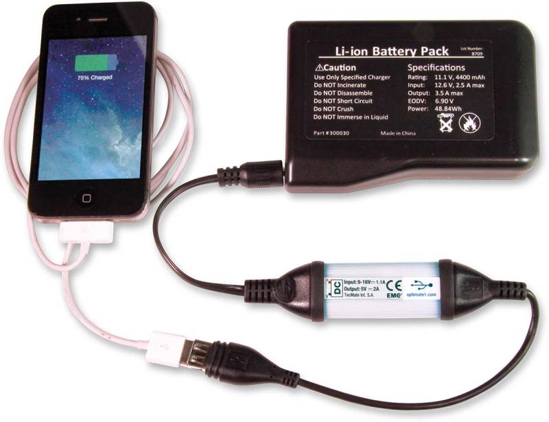 Fast charge your phone, GPS, camera & tablet from your 11.1V (12V) battery used for heated apparel or use with OptiMate O-30 tankbag cable kit.