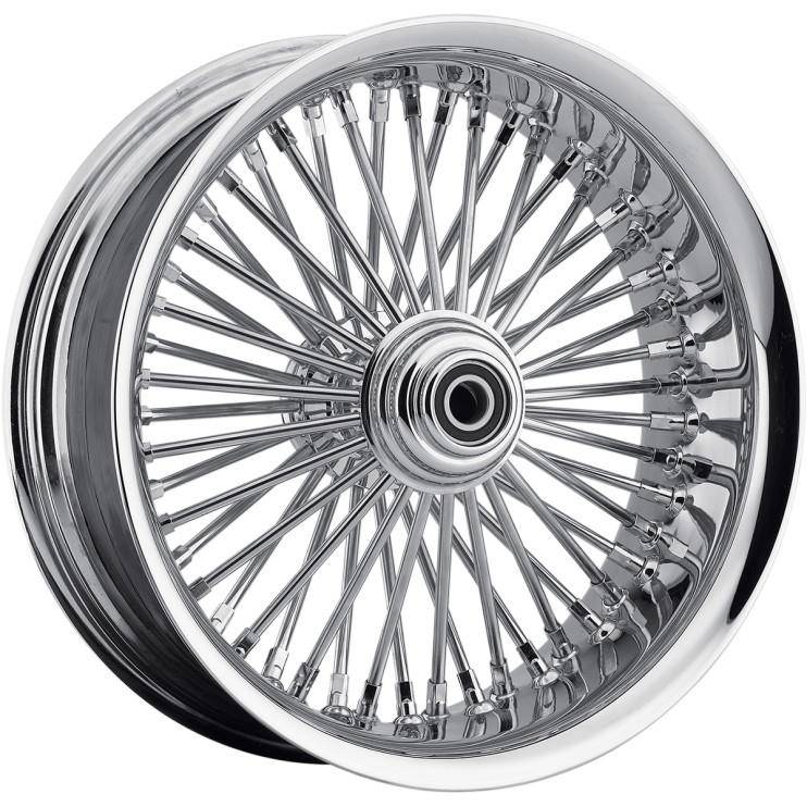 Wheels feature radial laced (straight) 3/8in. polished stainless steel spokes, chrome cold-rolled steel nipples, chrome billet hubs and chrome aluminum softlip rims