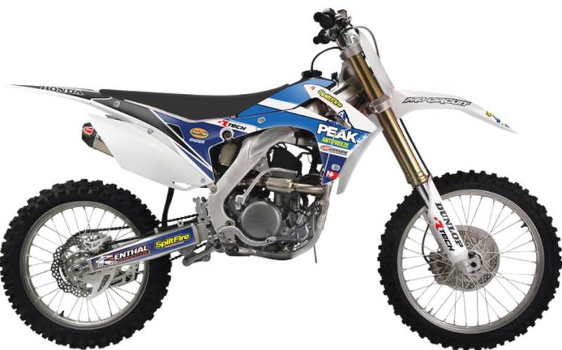 Peak Retro Graphics kit includes high-quality screen printed front and rear fender decals, tank shroud decals, fork decals, air box decals and swing arm decals (seat cover, number plate backgrounds and additional white plastic is not included with the kit)