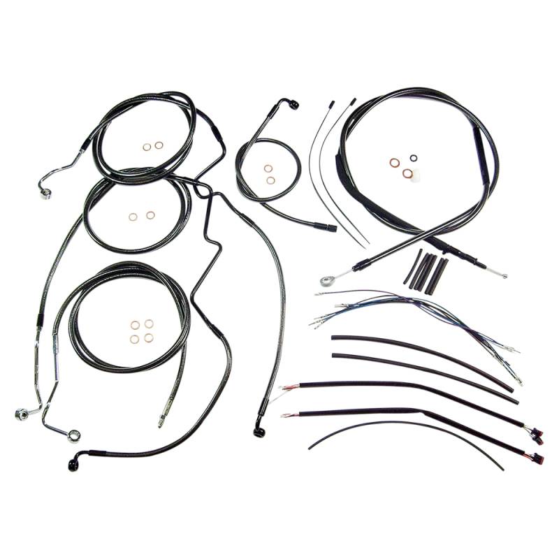 Kits include throttle and idle cables (except 08-15 Dressers), clutch cable or hydraulic clutch line, front brake lines, copper crush washers, hardware and correctly colored wiring extensions with OE-style connectors and shrink tube