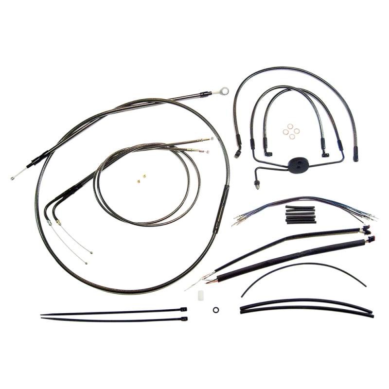 Kits include throttle and idle cables (except 08-15 Dressers), clutch cable or hydraulic clutch line, front brake lines, copper crush washers, hardware and correctly colored wiring extensions with OE-style connectors and shrink tube