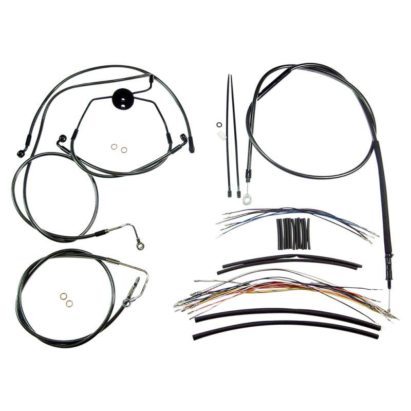 Kits include throttle and idle cables (except 08-15 Dressers), clutch cable or hydraulic clutch line, front brake lines, copper crush washers, hardware and correctly colored wiring extensions with OE-style connectors and shrink tube