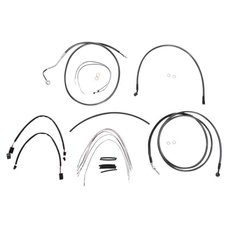 Kits include throttle and idle cables (except 08-15 Dressers), clutch cable or hydraulic clutch line, front brake lines, copper crush washers, hardware and correctly colored wiring extensions with OE-style connectors and shrink tube