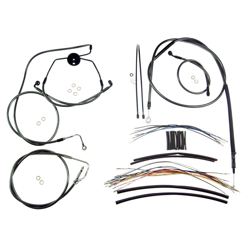Kits include throttle and idle cables (except 08-15 Dressers), clutch cable or hydraulic clutch line, front brake lines, copper crush washers, hardware and correctly colored wiring extensions with OE-style connectors and shrink tube