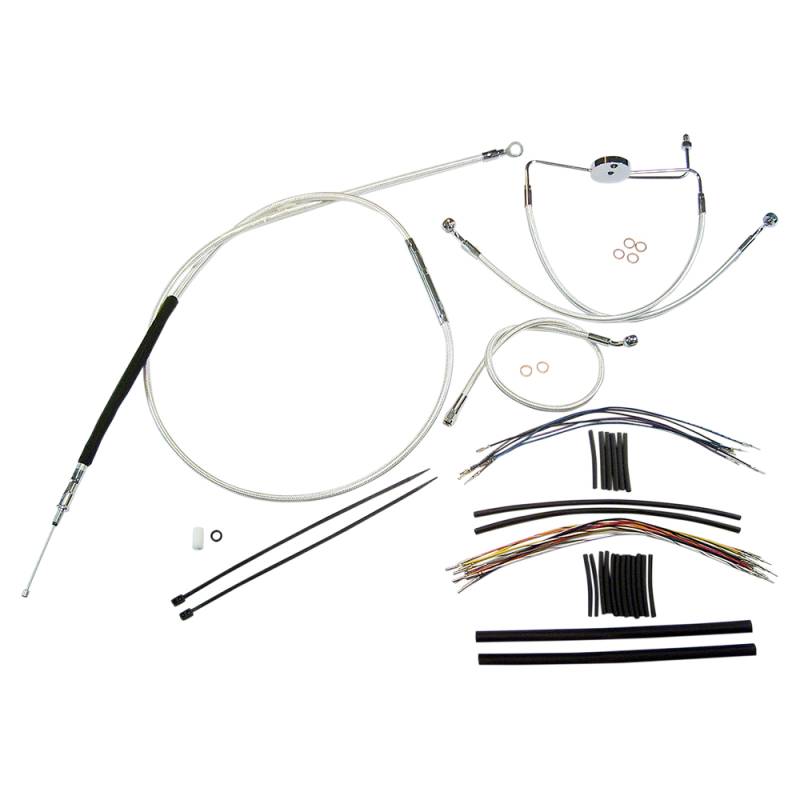 Kits include throttle and idle cables (except 08-15 Dressers), clutch cable or hydraulic clutch line, front brake lines, copper crush washers, hardware and correctly colored wiring extensions with OE-style connectors and shrink tube