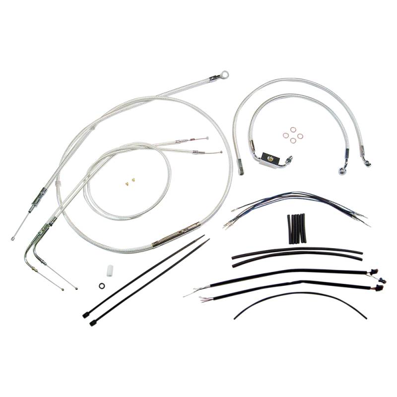 Kits include throttle and idle cables (except 08-15 Dressers), clutch cable or hydraulic clutch line, front brake lines, copper crush washers, hardware and correctly colored wiring extensions with OE-style connectors and shrink tube