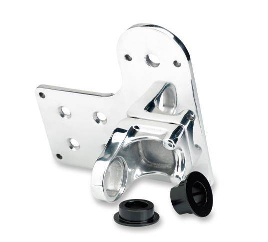 Two different hat-shaped chromoly spacers; one with a keyway to fit aftermarket chopper frames and one flush mounted for stock axle plates, fit inside the alloy bracket to provide solid clamping power beneath the rear axle