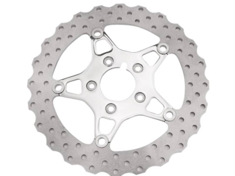 Floating rotors have polished stainless steel or black chrome center hubs