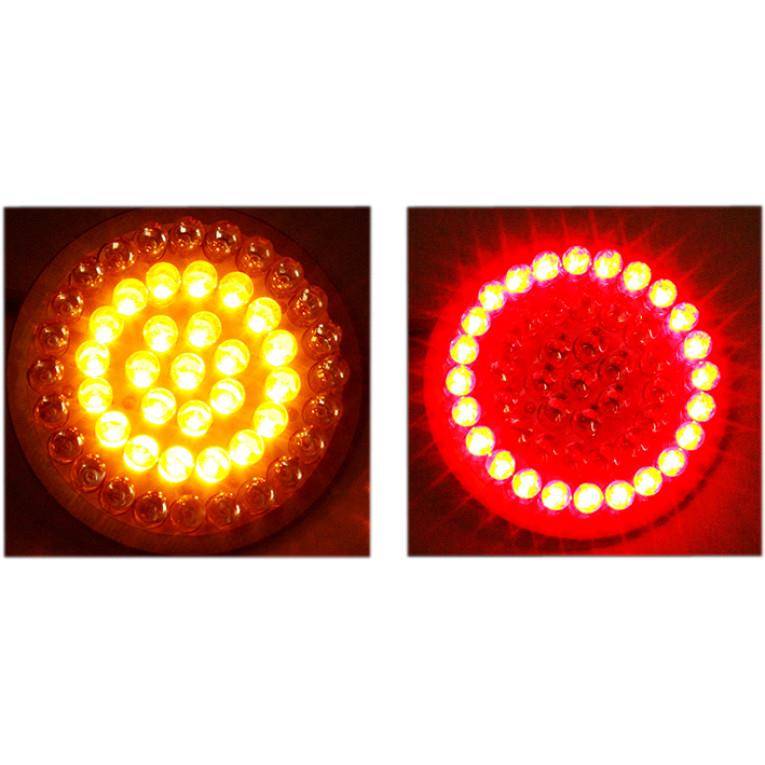 Features a low intensity red running LEDs, high intensity red brake LEDs, and high intensity amber turn signal LEDs