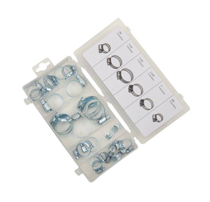 Includes eight 5/8in., six 7/8in., four 1in., two 1 1/16in., two 1 1/4in., and four 1 1/2in. hose clamps