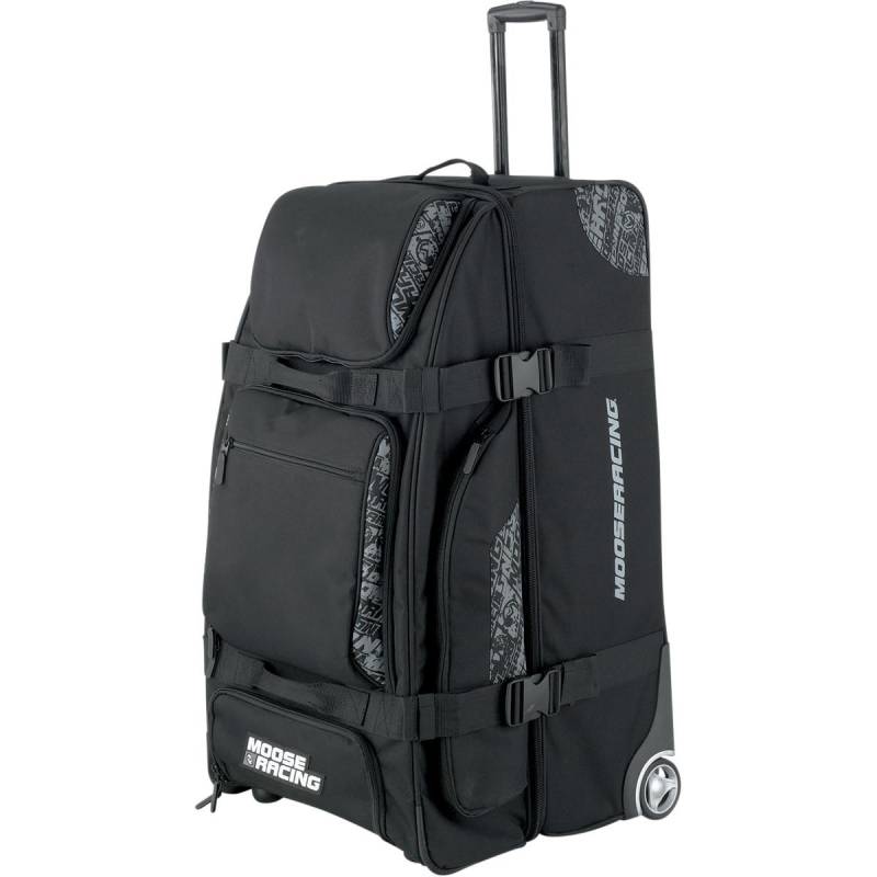 Retractable handle for easy towing; the bag rolls smooth on varied surfaces with quality rubber tread wheels
