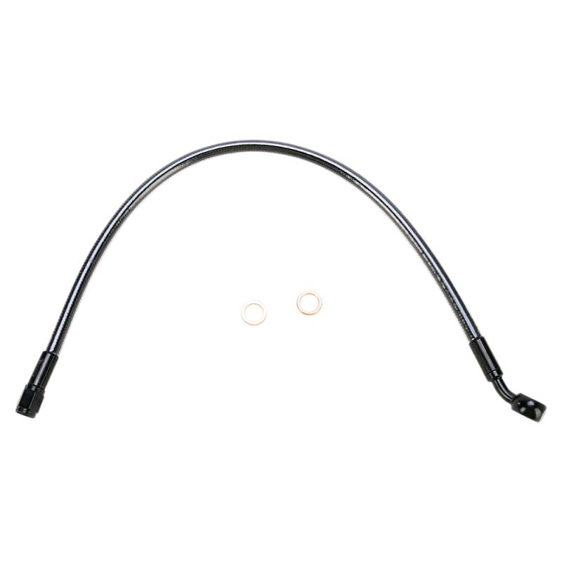 Non-stock applications require taking a measurement for the upper brake line length and banjo angle to ensure correct fitment
