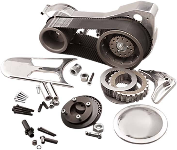 3in electric start kits include front pulley, belt, clutch hub and clutch basket and clutch set (consists of two half plates, four full plates and five steel drive plates), 6061 T-6 billet motor plate, outside guard and polished pulley cover