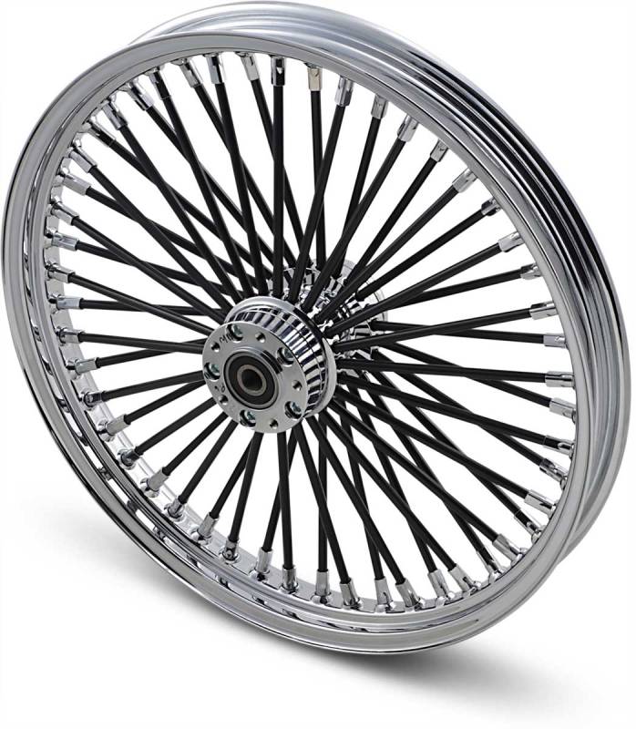 Wheels feature radially laced (straight) 3/8in. black stainless steel spokes with custom nipples, billet chromed aluminum custom hubs and polished chrome steel rims