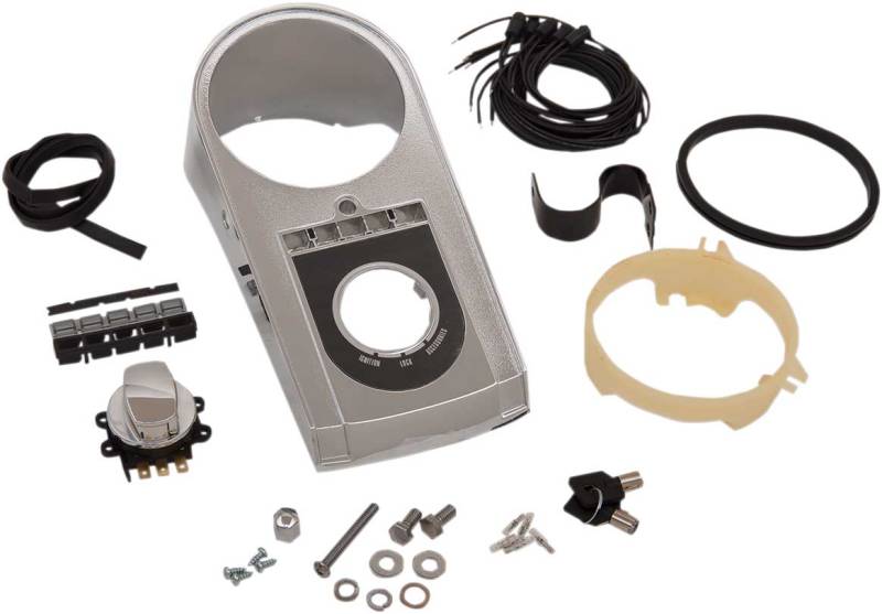 Kit includes chrome die-cast dash, rubber seal, back clamp, name plate, indicator lights, dash trim and ignition switch with keys