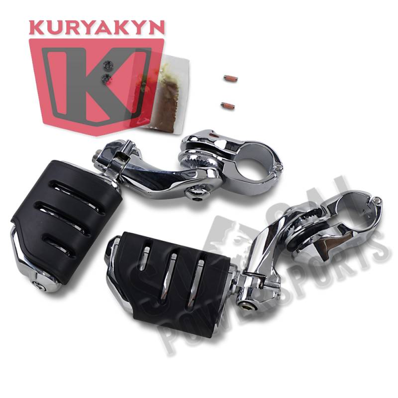 Gain an incredible range of adjustability! The entire assembly may be moved up or down on the engine guard. The arm & footpeg may be further adjusted along a vertical or horizontal arc. A unique clevis permits angle adjustment of the footpeg. The heavy-duty Quick Clamp & sturdy offset arm ensures that the footpegs will clear fairing lowers & will stay where you put them! Recommended for any model using 1 1/4in. engine guards.
