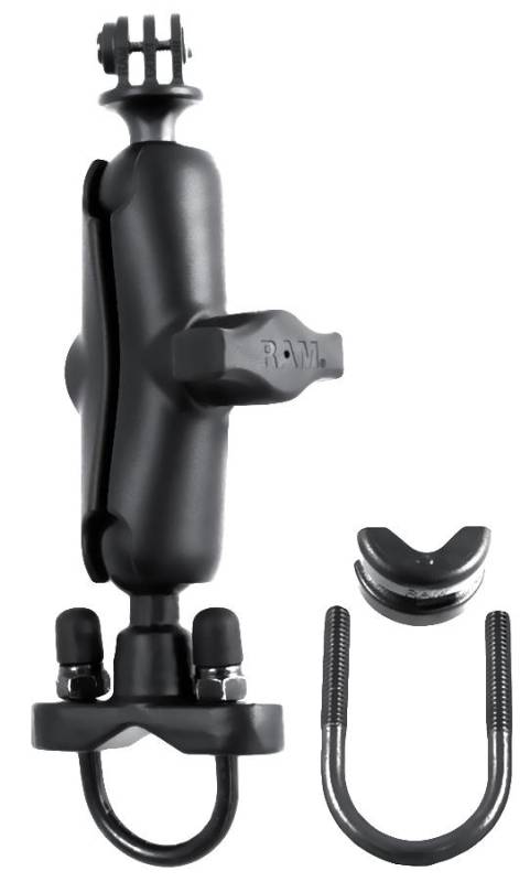 The RAM-B-149Z-GOP1U consists of a zinc coated u-bolt base, standard size double socket arm and 1in. diameter ball with custom GoPro Hero adapter. The mount is designed with a RAM 1in. diameter patented rubber ball and socket system that has adjustment points at both ends of the double socket arm; this allowing for almost infinite adjustment and perfect viewing angles. Included in this package is hardware that will accommodate rails from 0.50in. to 1.25in. in diameter. The base includes black cover caps to be placed over the exposed ends of the u-bolt. The included composite rail adapter can narrow the rail to a minimum width of 0.5in..