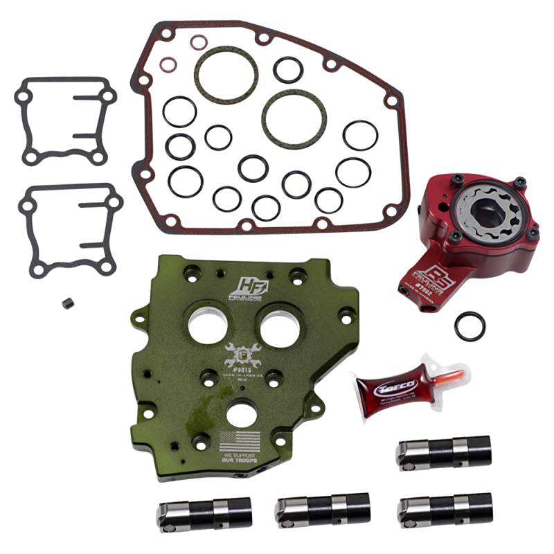 Race Series kits include blueprinted 7075 hard anodized billet aluminum oil pump; 7075 hard anodized cam plate; full-travel, slow leak down hydraulic roller lifters and installation gasket kit