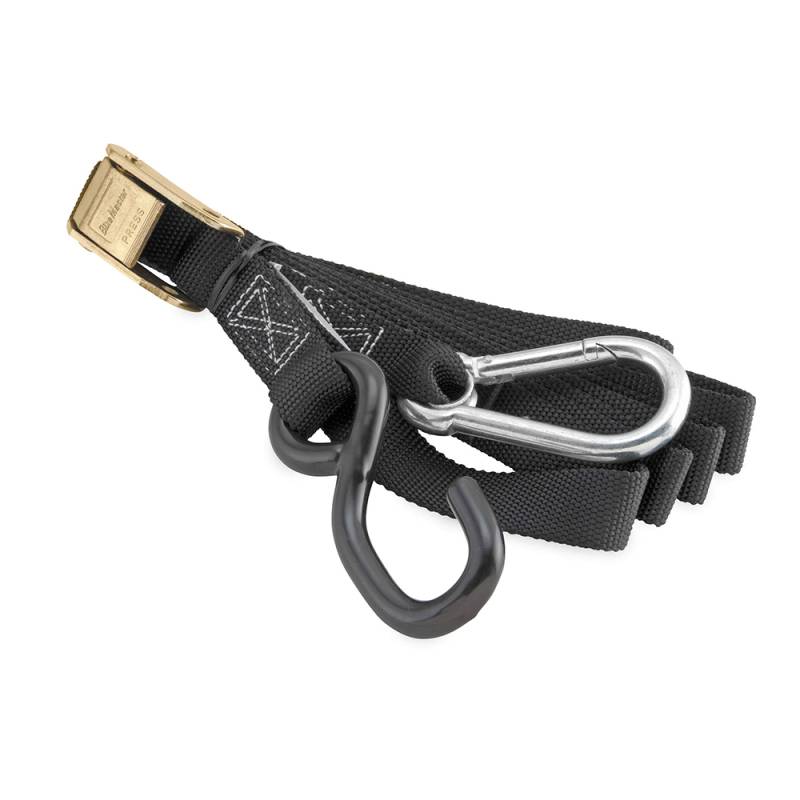 Carabiner with interlocking closure insures that this tiedown stays put