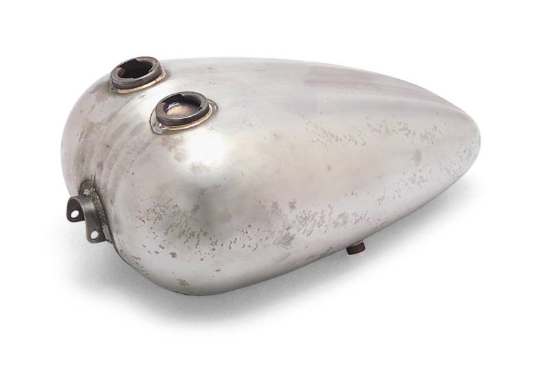 20 long, 13 wide, 8 deep with left late model petcock outlet and indented bottom for rocker box clearance; tunnel is 19-1/2 long, 2-3/16 wide, 4-1/4 deep