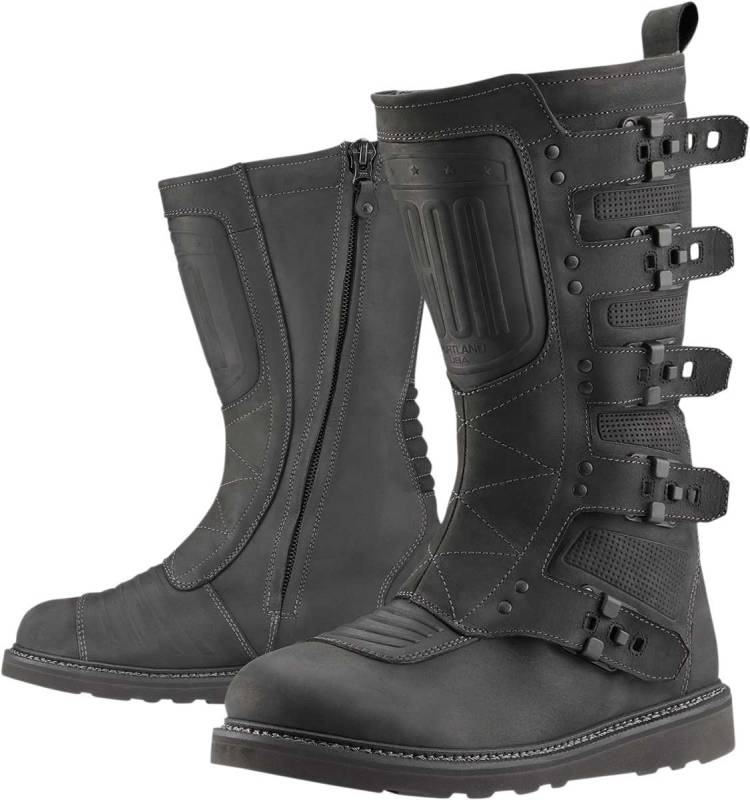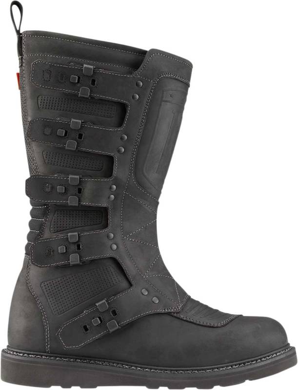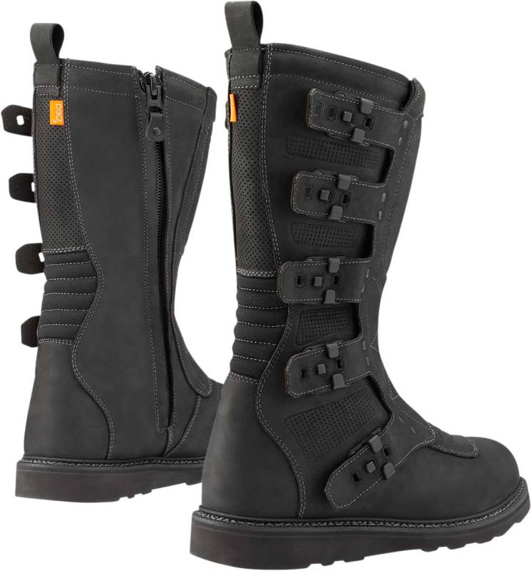 Re-introducing the Elsinore2 mens boot from ICON: all the features and vintage motocross styling you loved in the original Elsinore, but upgraded with materials and fit. The premium leather uppers are married to the slip-resistant sole for rugged style with a comfortable fit. The Elsinores five-strap chassis allows for an adjustable fit and includes a side zipper for easy on and off. The reinforced shin plate and internal D3O ankle inserts provide functional coverage should your ride take a turn for the worse. Finally, the hi-rebound EVA foam insole provides all-day motorcycle riding comfort and support. Whether youre scavenging guzzoline in the Wasteland or living out your vintage vibes, the Elsinore2 boot has what you need.