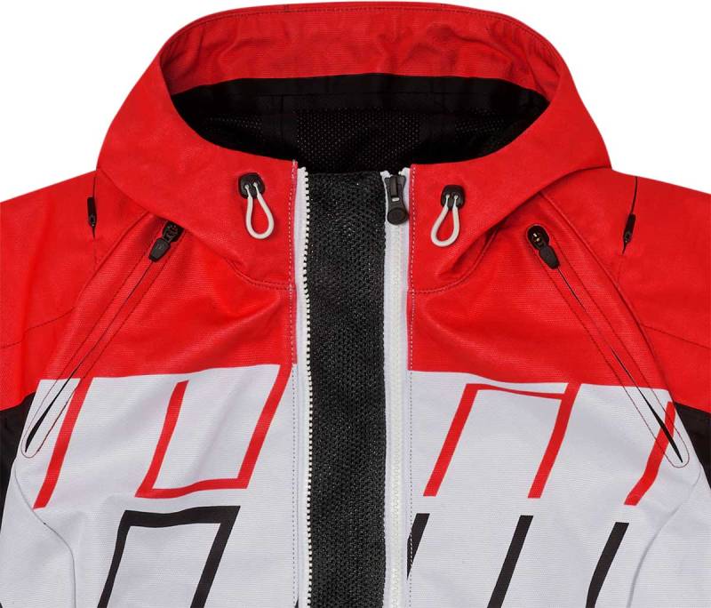 Punched-up graphics with twice the flash of ElvisΓÇöthat's the realm of the Airform Retro motorcycle jacket. Built from lightweight reinforced polyester, the relaxed-fit chassis is equipped with a full complement of D3O impact protectors (shoulder, elbow, back). The Airform jacket comes with our waterproof level WP1 rating and stowable hood should the weather turn ugly. The hood stows away when not in use to eliminate drag. When used for hot-weather riding, the AirFly mesh center vent and four zippered vents provide for the ultimate in airflow.